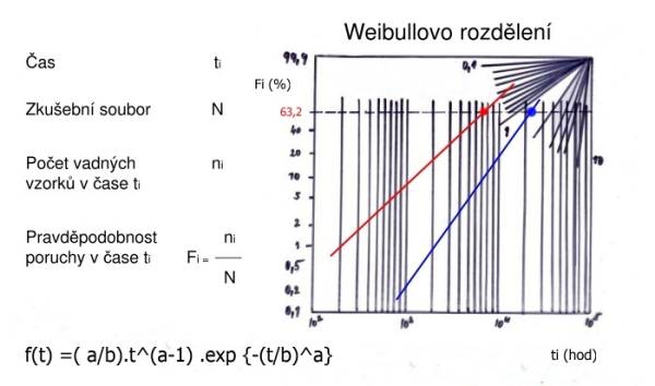 Při formulaci zrychlených zkoušek se řešil problém jak zesílit namáhání a při tom nezměnit mechanismus degradace. Toto grafické zpracování umožní rozhodnout jak byl tento požadavek splněn. Jsou-li modrá přímka (výchozí modelové namáhání) a červená přímka3) zesílené modelové namáhání „téměř“ rovnoběžné, jednalo se o stejný degradační proces. Hodnota 63,2 se nazývá „charakteristický život“ .