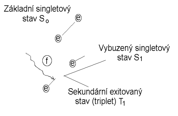 Excitací přechází elektron z obsazeného orbitalu v základním stavu molekuly na orbital neobsazený (obr. 1). Většina molekul organických sloučenin má sudý počet elektronů, které jsou v základním stavu všechny spinově spárovány. Takovéto molekulové útvary mají nulový spinový rotační moment a nazývají se singlety So. Když dojde účinkem světla k vyzdvižení elektronu na neobsazený orbital, stanou se dva elektrony orbitalově nepárovými. Molekulový útvar přechází ze základního singletového stavu So do vzbuzeného singletového stavu Sn. Ve většině elektronových konfigurací nemusí zůstávat spiny elektronů spárované (Pauliho vylučovací princip) a často dochází k inverzi spinu. Inverzí spinu se vytváří excitovaný stav. Vzniklý útvar se nazývá triplet Tn a jeho spinový rotační moment je 1. Tripletový stav představuje nižší stupeň excitace a má o několik řádů delší životnost než excitované stavy singletové.
