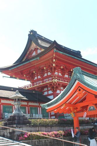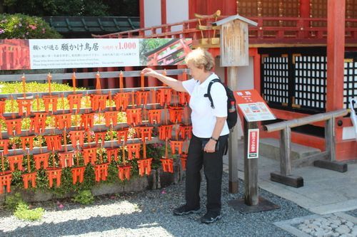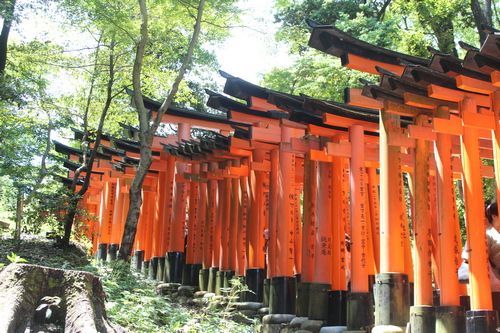 Je to nejvýznamější šintoistická svatyně v Japonsku. V Kjótu stojí už od osmého století, i když její hlavní budova byla dostavěna až v roce 1499. Základním znakem šintoistických svatyň jsou červené dřevěné brány zvané Torii, které jsou vždy před samotným chrámem. Postavení Torii si můžete na 30 let zaplatit. Na místo jsme dorazili kolem poledne. Bylo velké horka a přesto, že je pracovní den, tak tam bylo lidí jako na prvního máje na Vaclaváku.