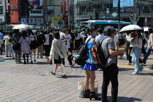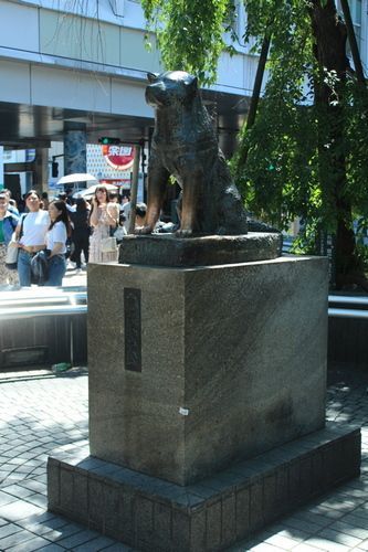 Poblíž této křižovatky má sochu věrný pes Hačiko. Ve dvacátých letech minulého století každý den ráno doprovázel svého pána na nádraží, které bylo na tomto místě a čekal, až se mu pán vrátí z práce. Jednoho dne však jeho pán (učitel na univerzitě) dostal při výuce infarkt a nevracel se. Pes mu tam přesto chodil přes deset let naproti. O jeho osudu se dozvěděl novinář, který příběh zveřejnil a lidé věrnému psovi nechali ještě za jeho života postavit pomník. Teď je to místo, kde se stojí fronta na vyfotografování