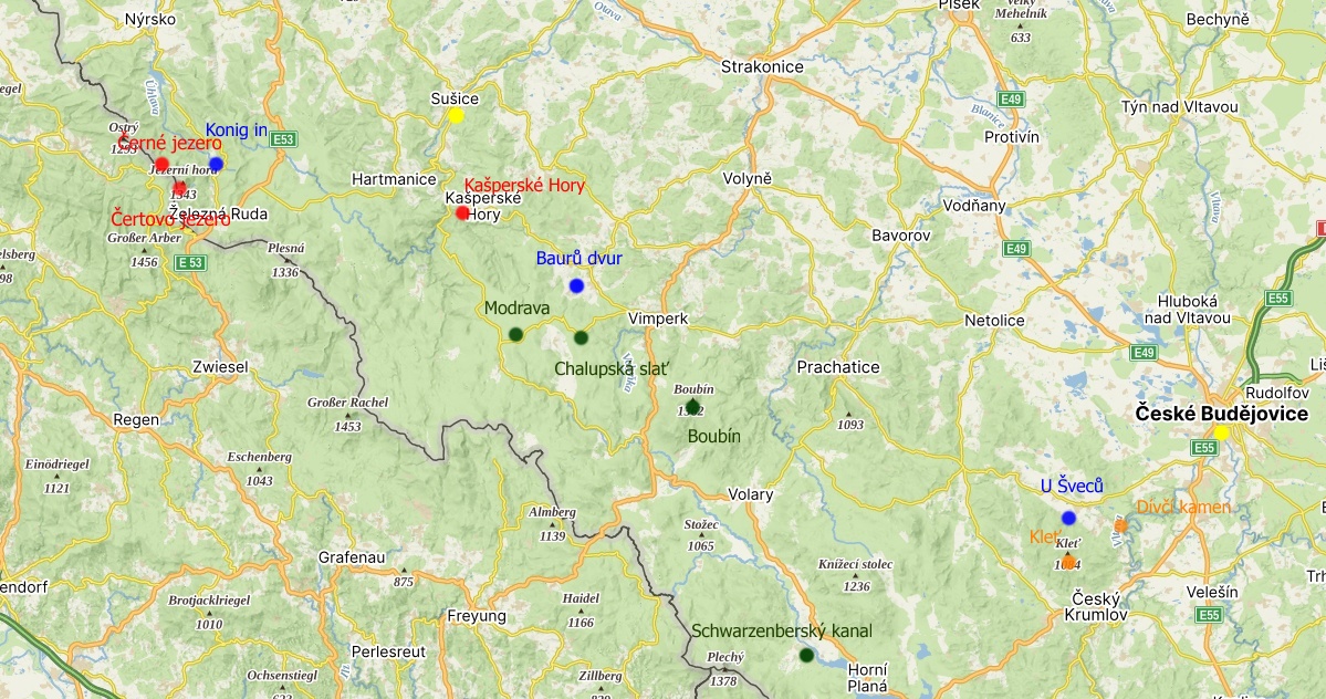 V 15:27 odjezd autobusem z Jelení do Nové Pece a odtud autem na ubytování ve Zdíkově (Baurů dvůr) přes Kvildu s odbočkou na Modravu.