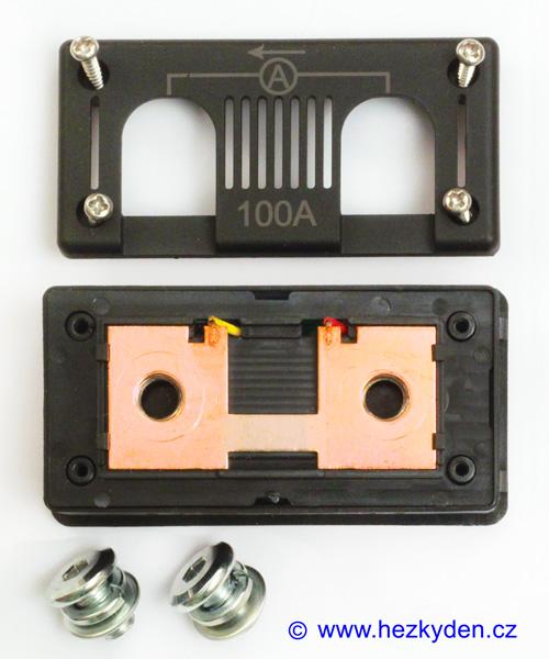 Vývody z proudového bočníku se (prostřednictvím dvou šroubů M8) zapojují do záporné větve na výstup měřeného zdroje (viz schémata zapojení). Na vodiče použijte měděná kabelová oka, ne levná železná pozinkovaná, jinak budete mít průser. Viděli jste někdy co udělá proud kolem 300 A při průchodu místem s velkým přechodovým odporem? (Nemám rád šetřílky). I tak by bylo asi lepší vyměnit šrouby za mosazné.